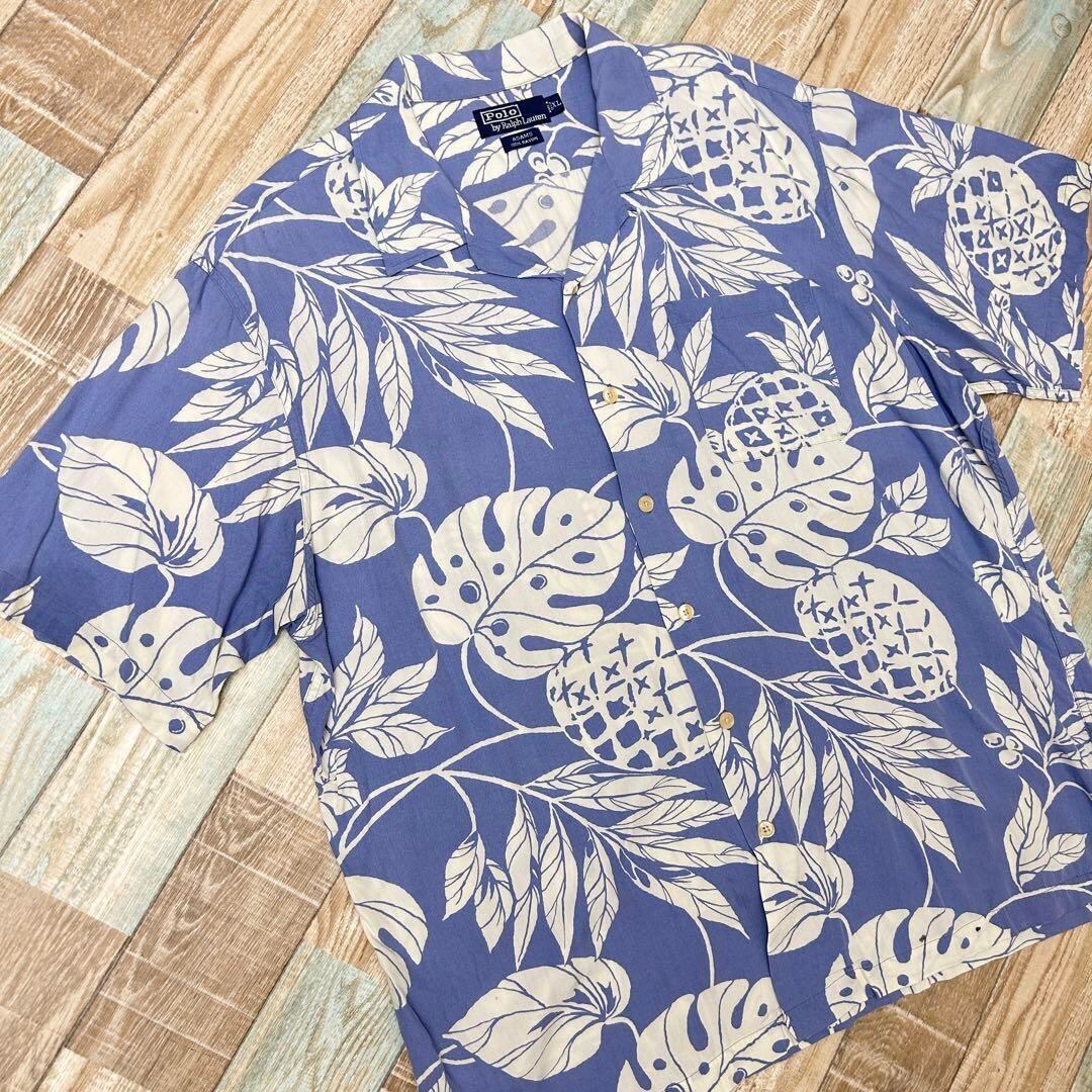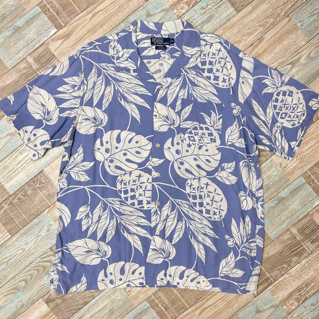 90s Polo by Ralph Lauren ポロ バイ ラルフローレン ADAMS 柄シャツ 総柄 パイナップル レーヨン 水色 XL