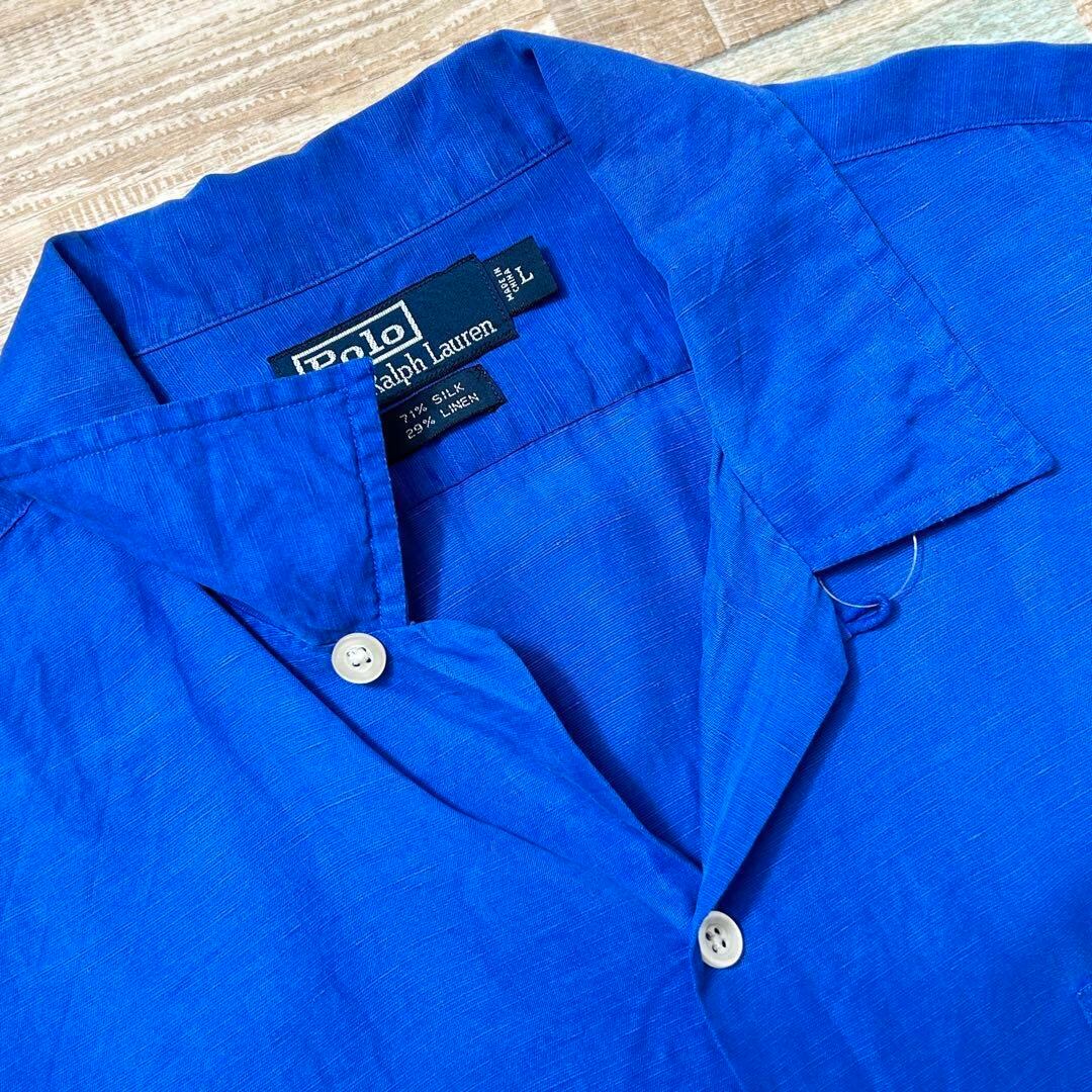 90s Polo by Ralph Lauren ポロ バイ ラルフローレン 完全無地 開襟 オープンカラー ブルー シルク リネン L