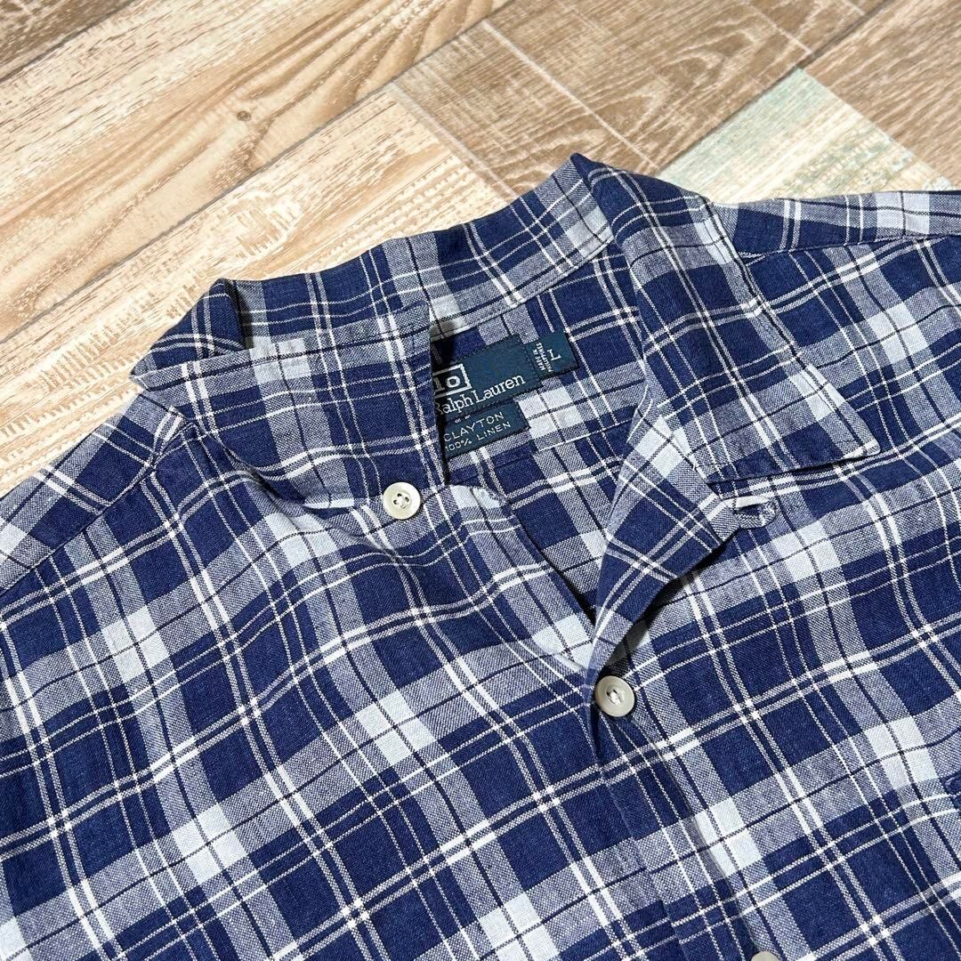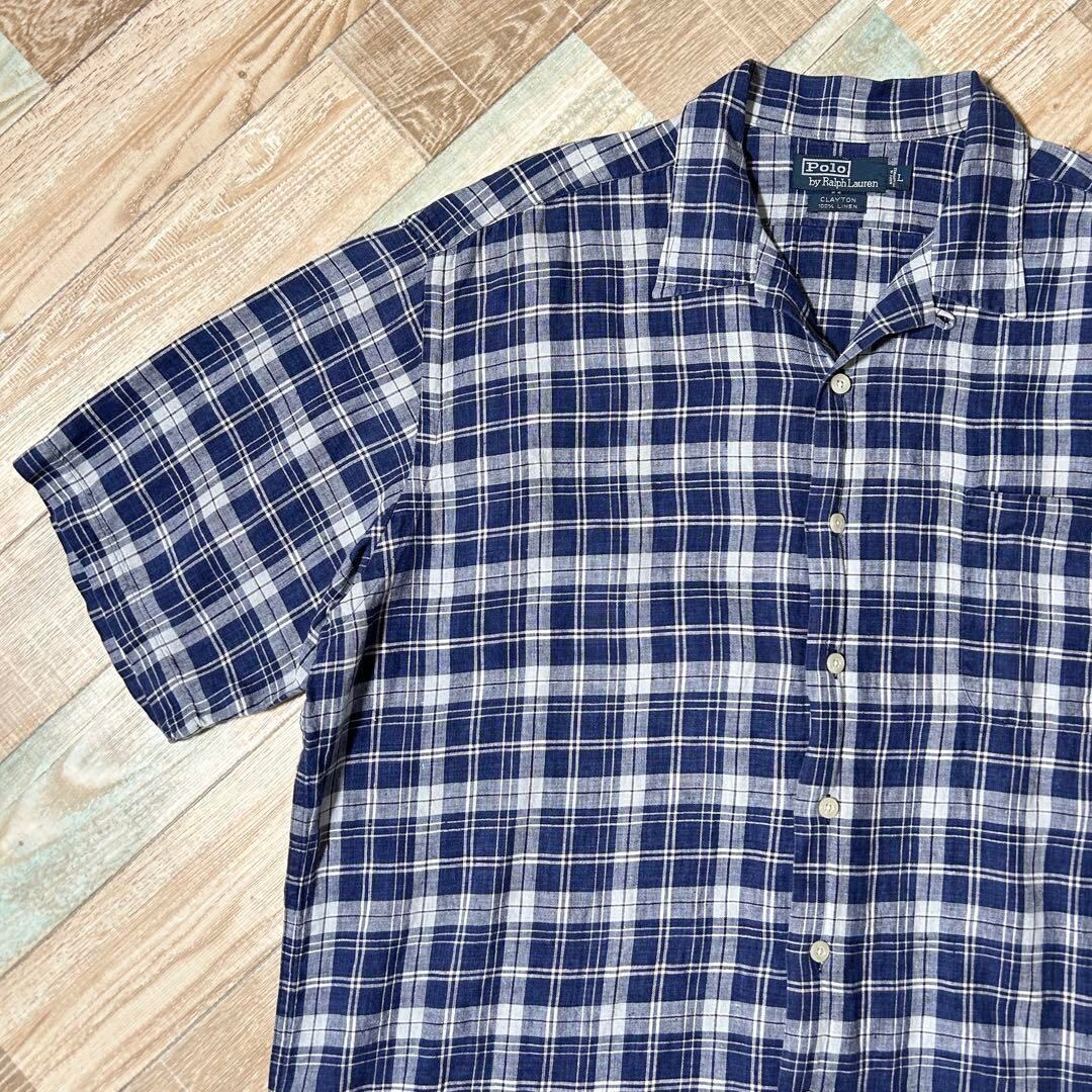 90s リネン100% Polo by Ralph Lauren ポロ バイ ラルフローレン CLAYTON 開襟 オープンカラー チェック ネイビー L