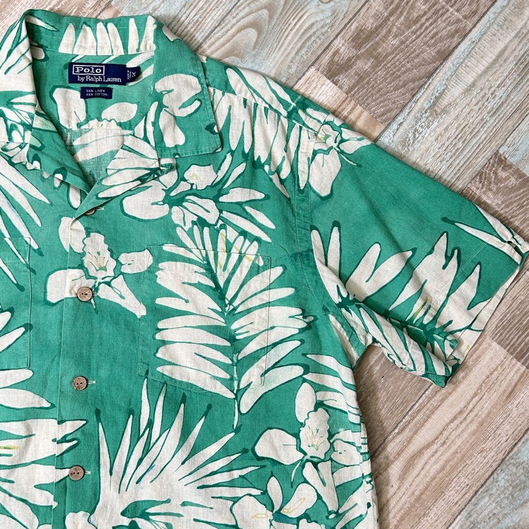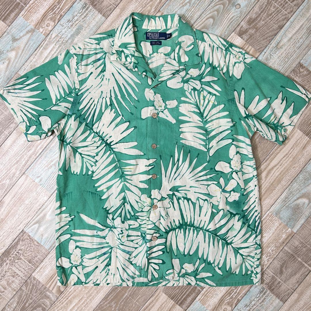 90s Polo by Ralph Lauren ポロ バイ ラルフローレン アロハシャツ リーフ 総柄 柄シャツ オープンカラー 開襟 リネン M 緑 グリーン