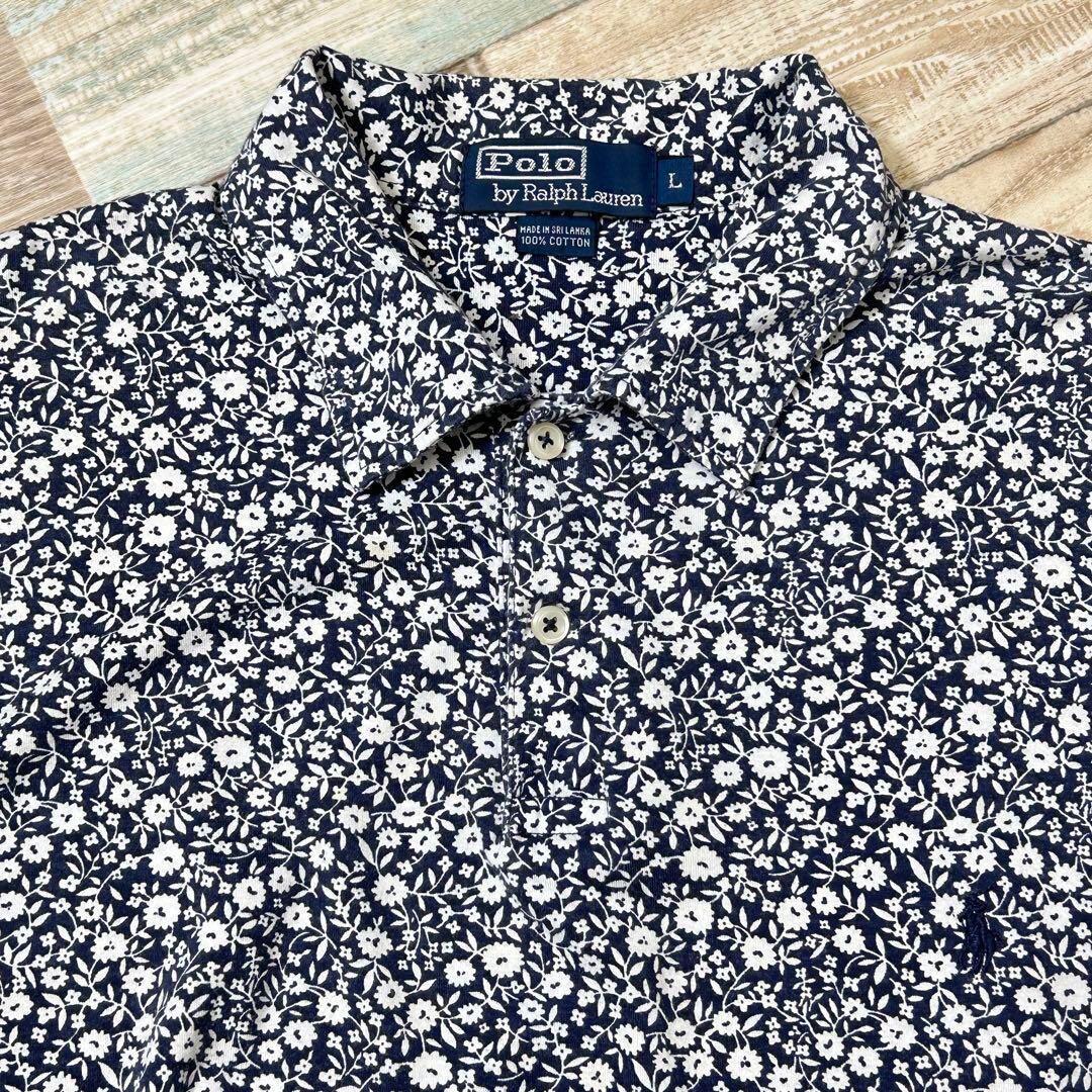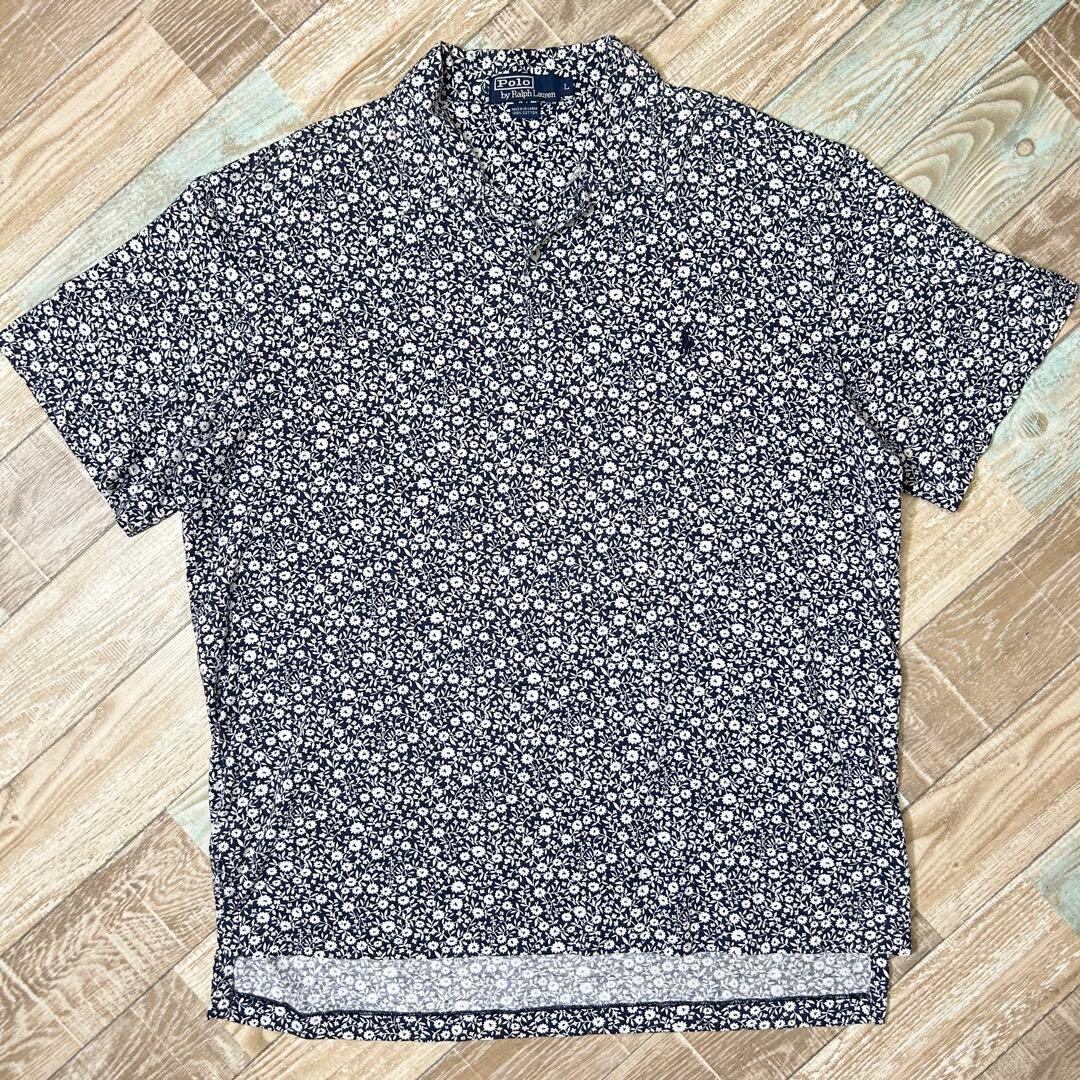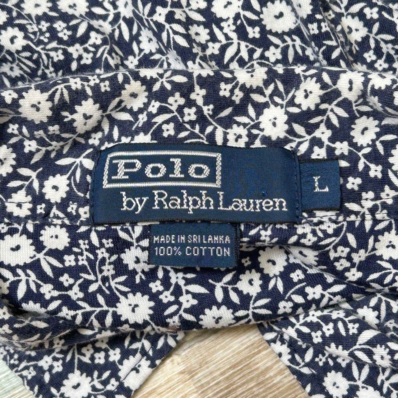 90s Polo by Ralph Lauren ポロ バイ ラルフローレン ポロシャツ Tシャツ生地 総柄 花柄 ポニー刺繍 紺 ネイビー L